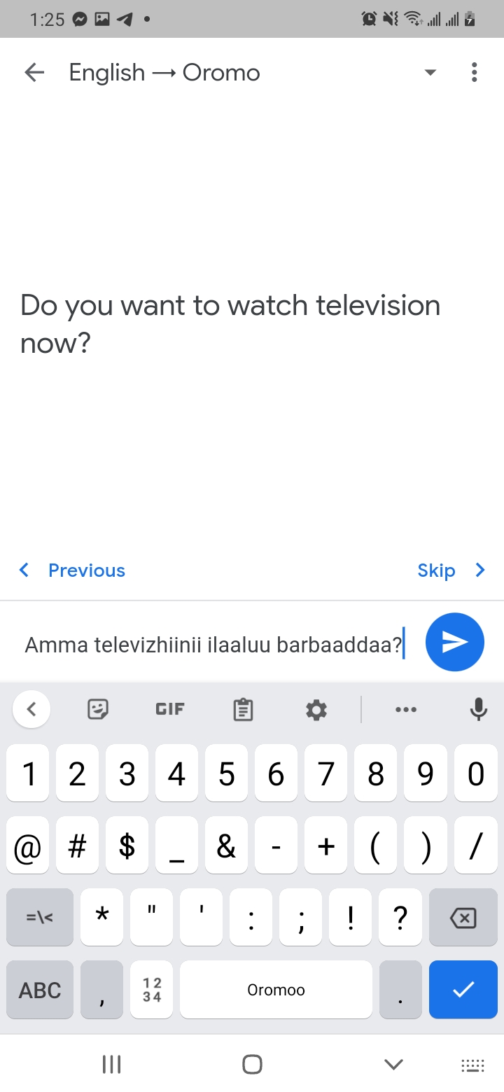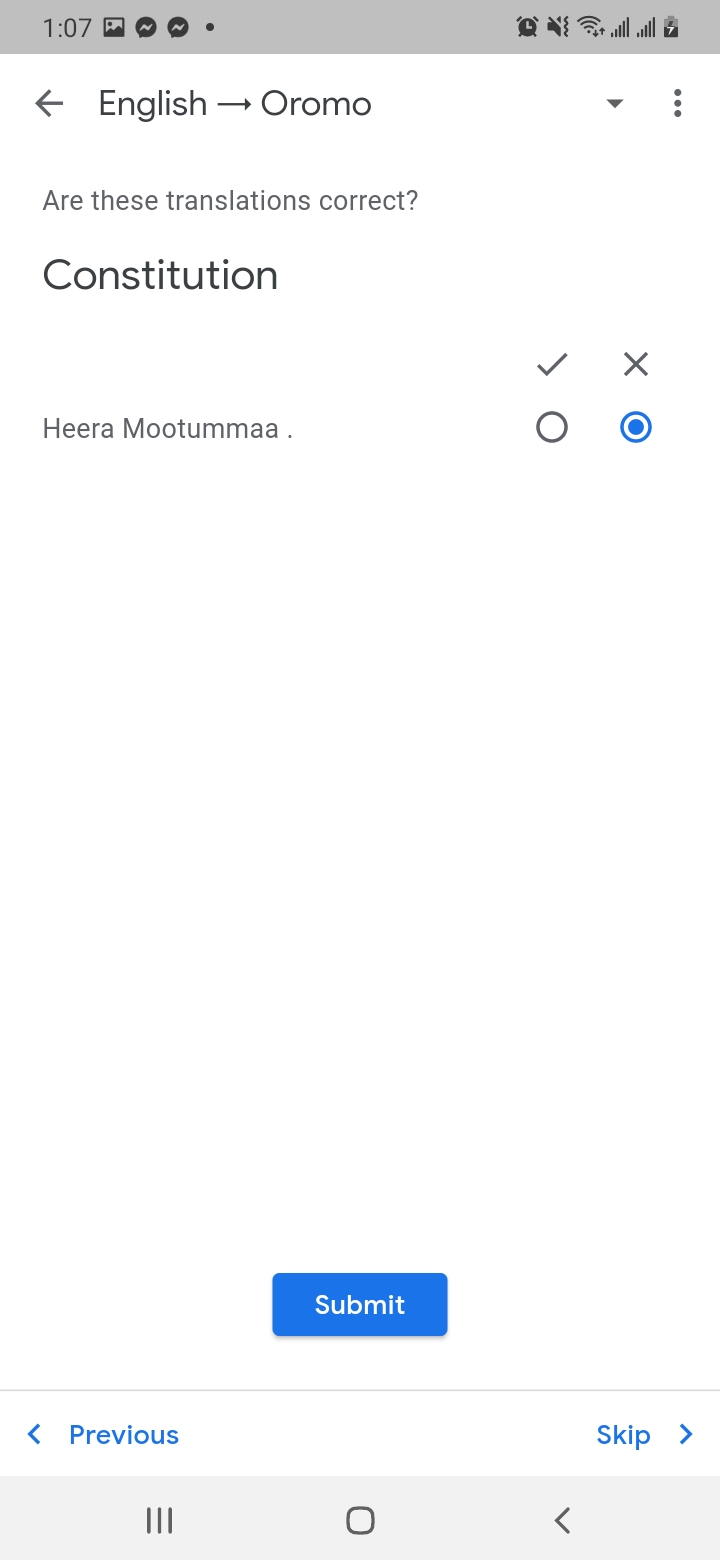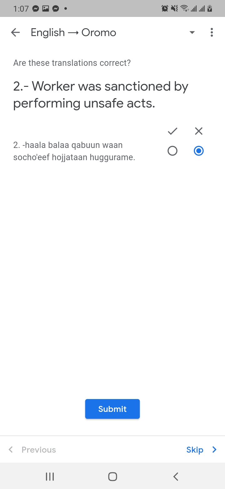 6. Bakka xiyyi agarsiisu ilaalun gara English – Oromo tti jijjiiraa 7. Bakka halluu magarisaan haguugame yoo tuqxan kanneen namootni biroo hiikan akka gulaaltaniif isin gaafata. isin kan sirrii ta’ee LIKE kennituuf, kan sirrii hin taane DISLIKE kennituuf. yoo hin beekne SKIP tuquun gara itti aanutti dabartu.